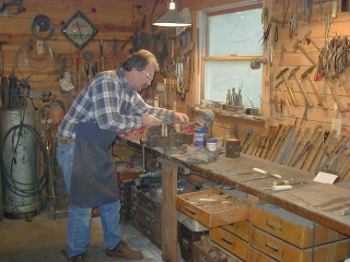 David does not hesitate to state that Walt was a good teacher. "He loved to make things with his hands, and it showed," remarks David. "He could make anything from jewelry of fine quality to a rough hammered blade on his 300+ pound anvil." Although Walt was a remarkable teacher, he was from the old school of learning and did not hand out compliments. Just the fact that David was allowed to remain in the shop and working was the sign that he was doing all right. The friendship between the two men grew closer as they worked together, and eventually Walt began trying to pay David for some of his work. David would never accept any money, but after several years of working with Walt, he would accept a knife once in a while as a payment. That was the start of his collection.